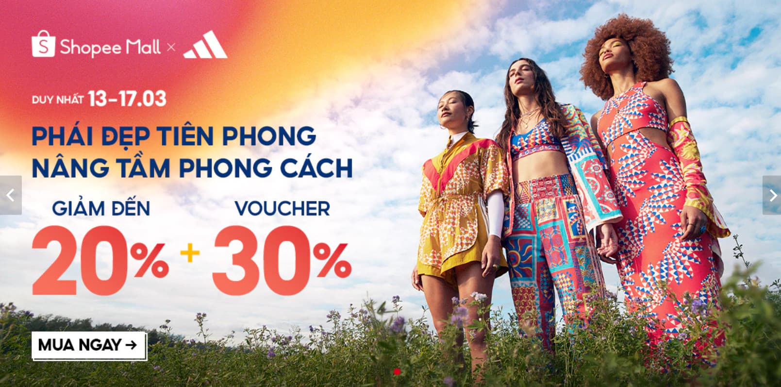 Tính đến thời điểm hiện tại, rất ít khi “ông lớn” Adidas góp mặt trong list sale định kỳ tại Shopee. Với tiêu chí “ít nhưng chất” Adidas đem đến cho 15.3 một loạt deal cực khủng như giảm 20% kèm voucher thêm 30%, 4 tầng giảm giá với đơn từ 1.8 triệu đồng. Chương trình áp dụng cho toàn bộ sản phẩm giày dép, quần áo và phụ kiện thể thao có mặt trong gian hàng. Cơ hội mua sắm chỉ có 1, nhớ vào lưu deal không hết bạn ơi.