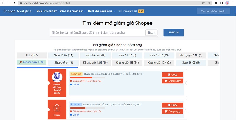 • Bước 2: Dán link sản phẩm trên vào mục tìm mã giảm giá shopee trên Shopee Analytics. Link phần tìm mã giảm giá xem tại đây: https://www.shopeeanalytics.com/vn/ma-giam-gia.html