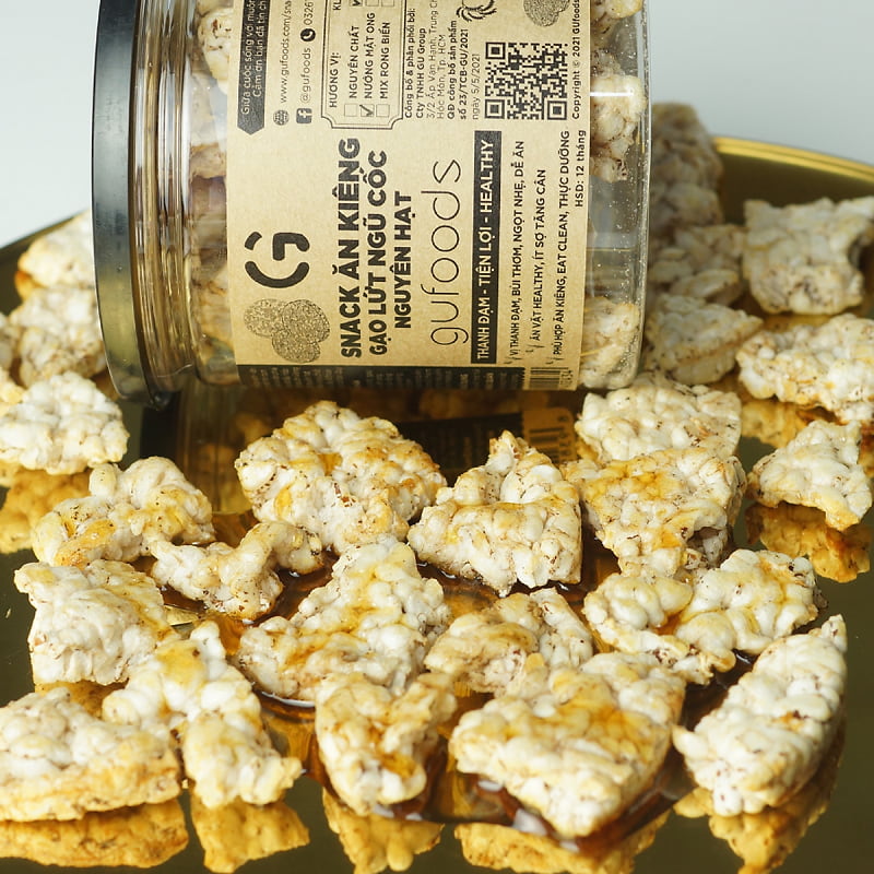 Snack ăn kiêng gạo lứt ngũ cốc nguyên hạt GUfoods giòn tàn và giàu dinh dưỡng. Snack có vị thanh đạm, bùi thơm, ngọt nhẹ và vô cùng dễ ăn. Đây là món ăn vặt healthy, ít tăng cân, lành mạnh, nói không với phụ gia và chất bảo quản.