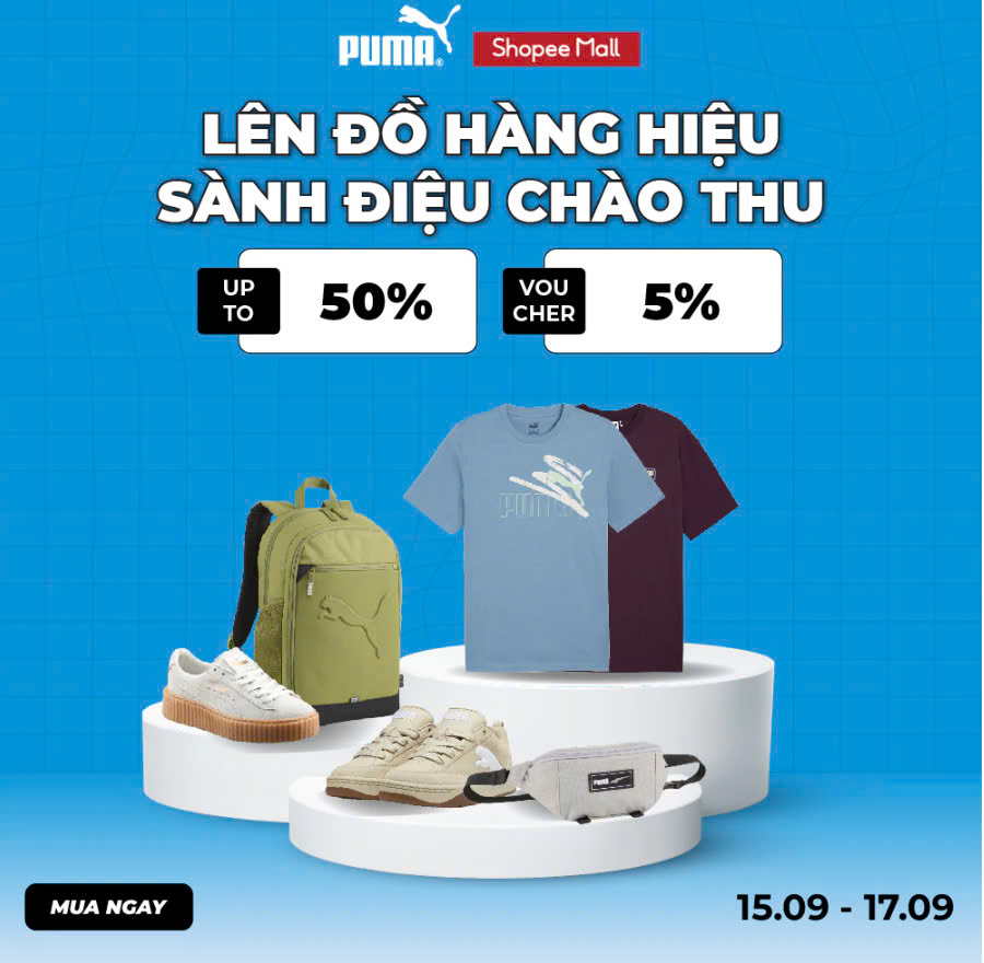 Tham gia vào siêu sale giữa tháng 9 của Shopee, Puma mở tiệc sale với ưu đãi giảm đến 50% cho toàn bộ sản phẩm, tặng thêm voucher giảm 5% khi đơn hàng đạt giá trị tối thiểu. Để xem kỹ hơn về các sản phẩm của Puma có trên Shopee cũng như các ưu đãi, bạn có thể truy cập link shop dưới đây: