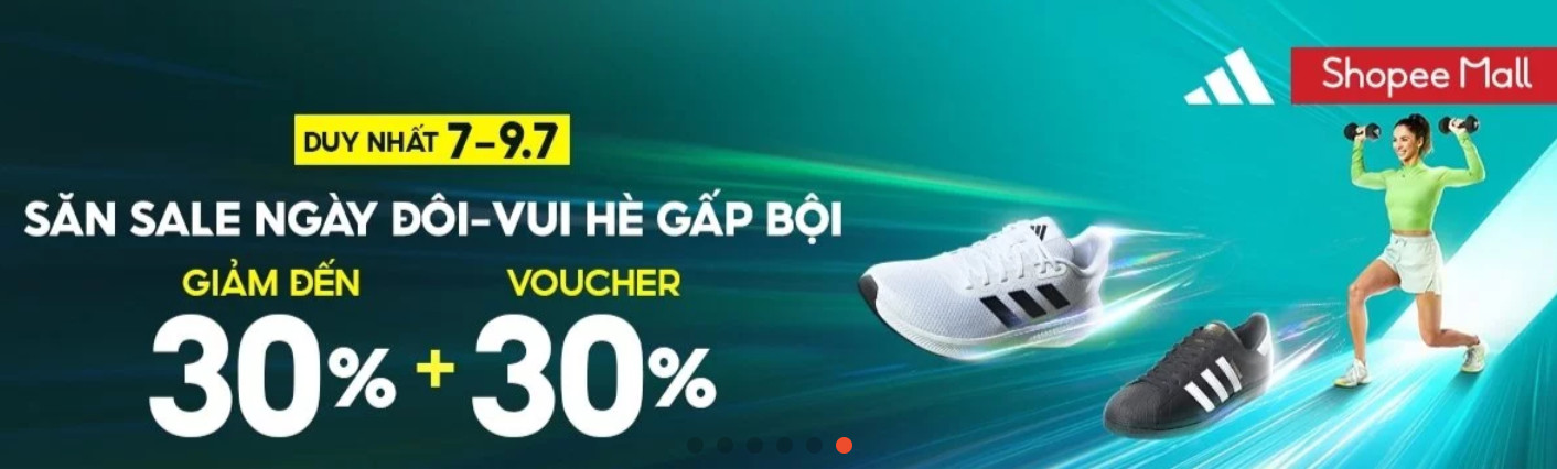 Tới với Shopee 7.7, adidas tặng bạn tới 2 tầng giảm giá gồm deal giảm trực tiếp tối đa 30% trên giá + voucher giảm 30%. Cơ hội mua sắm hời chưa từng có, nhấn tham gia cùng adidas ngay kẻo tiếc bạn ơi.