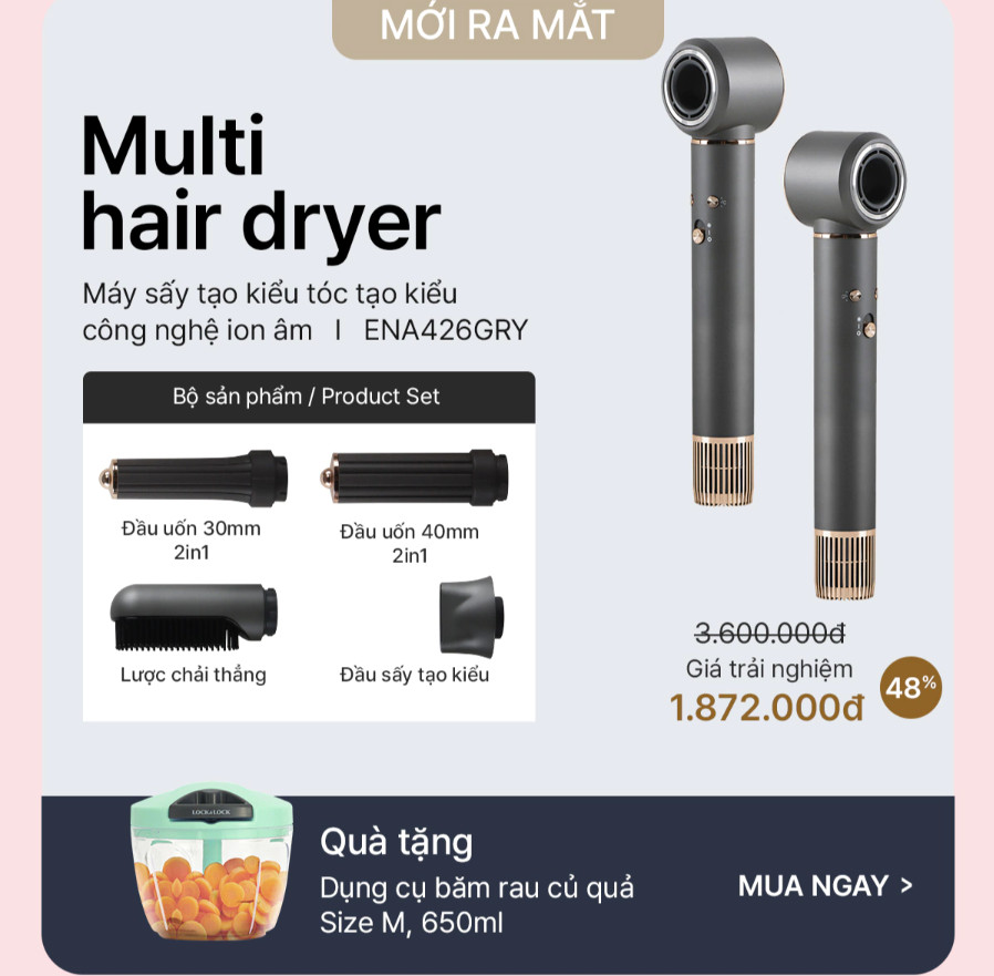 Máy sấy tạo kiểu LocknLock Multi Hair Dryer là model mới ra mắt của LocknLock sở hữu công nghệ ION âm 5 loại đầu sấy đa năng gồm: