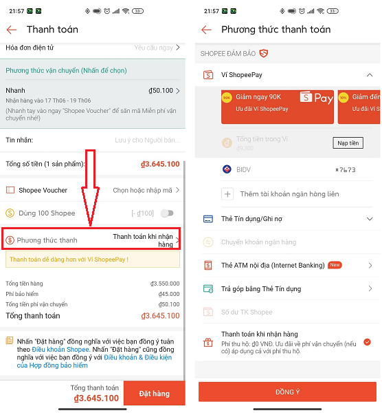 Bạn chọn sản phẩm mà bạn muốn mua và chọn thanh toán như bình thường. Tới bước thanh toán cuối cùng thì bạn ấn vào mục chọn “Phương thức thanh toán”. Sau đó, hệ thống sẽ hiển thị cho bạn một loạt phương thức phù hợp. Lúc này bạn cần chọn 1 trong 7 phương thức thanh toán phù hợp với nhu cầu sử dụng của bạn và ấn Đồng ý là xong.