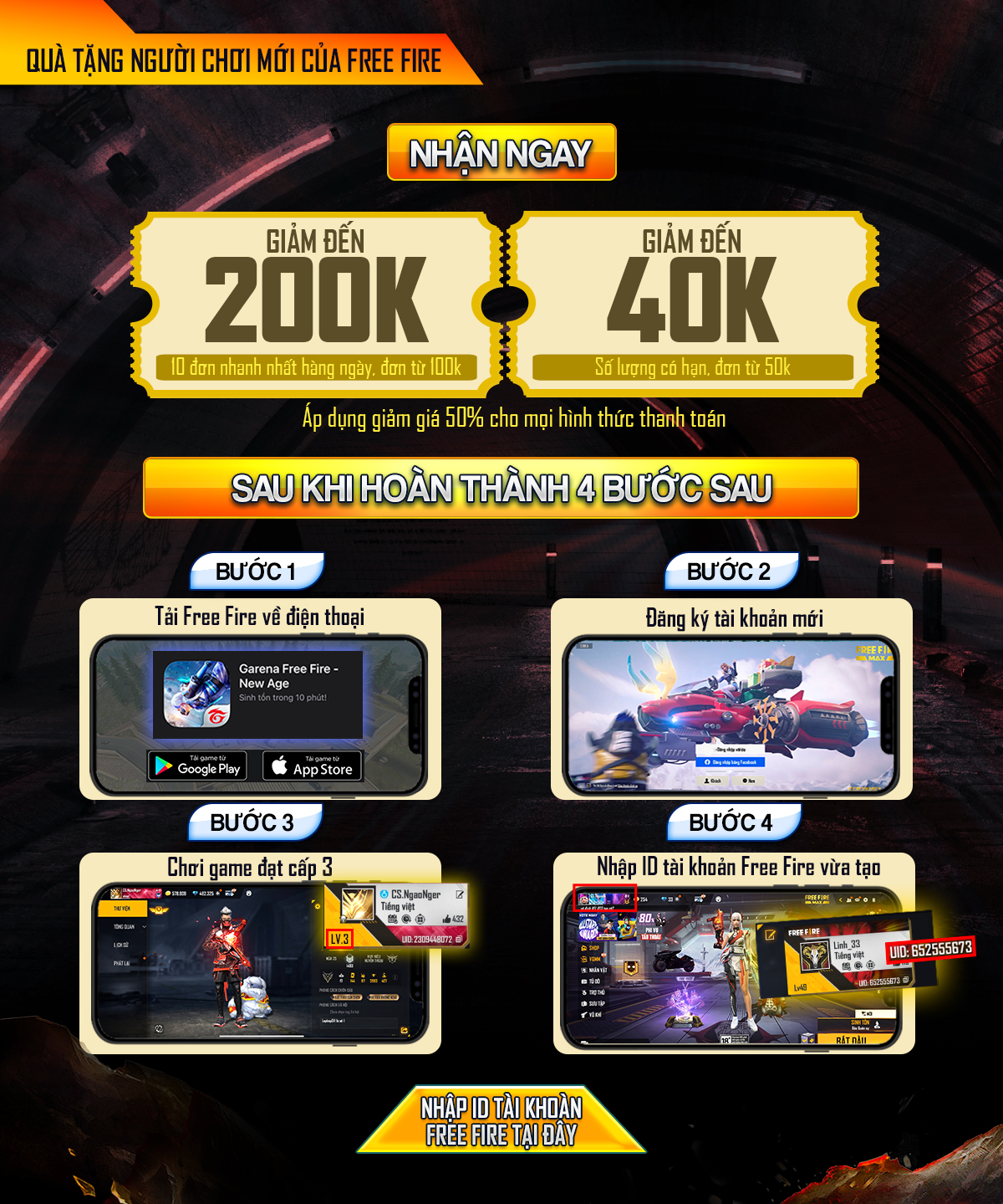 voucher 200K cho 10 đơn nhanh nhất hàng ngày, đơn từ 100K. Giảm đến 40K đơn từ 50K. Áp dụng giảm giá 50% cho mọi hình thức thanh toán.
