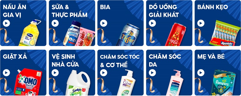 - Bách hóa: Bao gồm các thực phẩm thiết yếu trong đời sống hàng ngày như là bánh kẹo, rau củ, đồ uống…