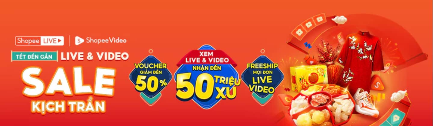 Không chỉ có Shopee Mall, nếu bạn tham gia Shopee Live hoặc xem Shopee Video từ 15 - 17.1 thì sẽ có cơ hội nhận voucher tới 50% áp dụng cho các sản phẩm trong phiên live hoặc trong video của shop.