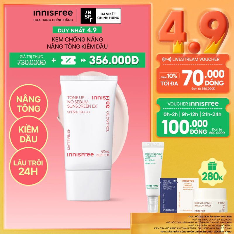 - Kem chống nắng INNISFREE Tone Up No Sebum EX SPF 50+ PA++++ 60ml