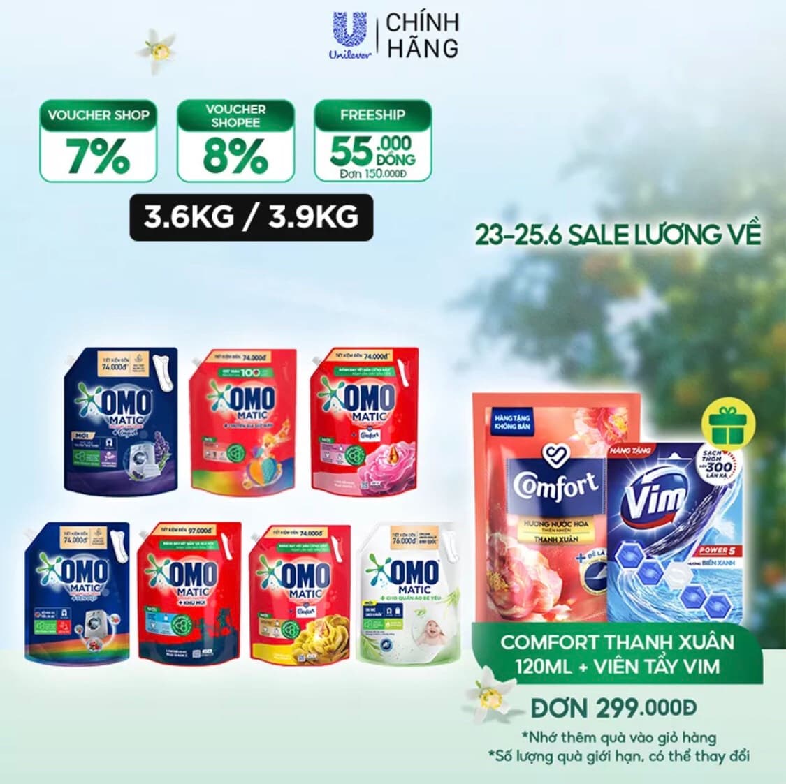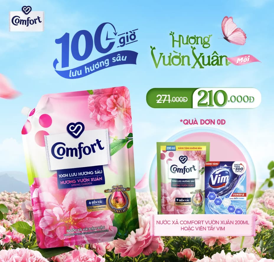 - Giá sale: 181.000 VND, tặng kèm Túi nước xả vải Comfort 120ml + Viên Tẩy Bồn Cầu Vim Power 5 Sạch Khuẩn Thơm Mát
