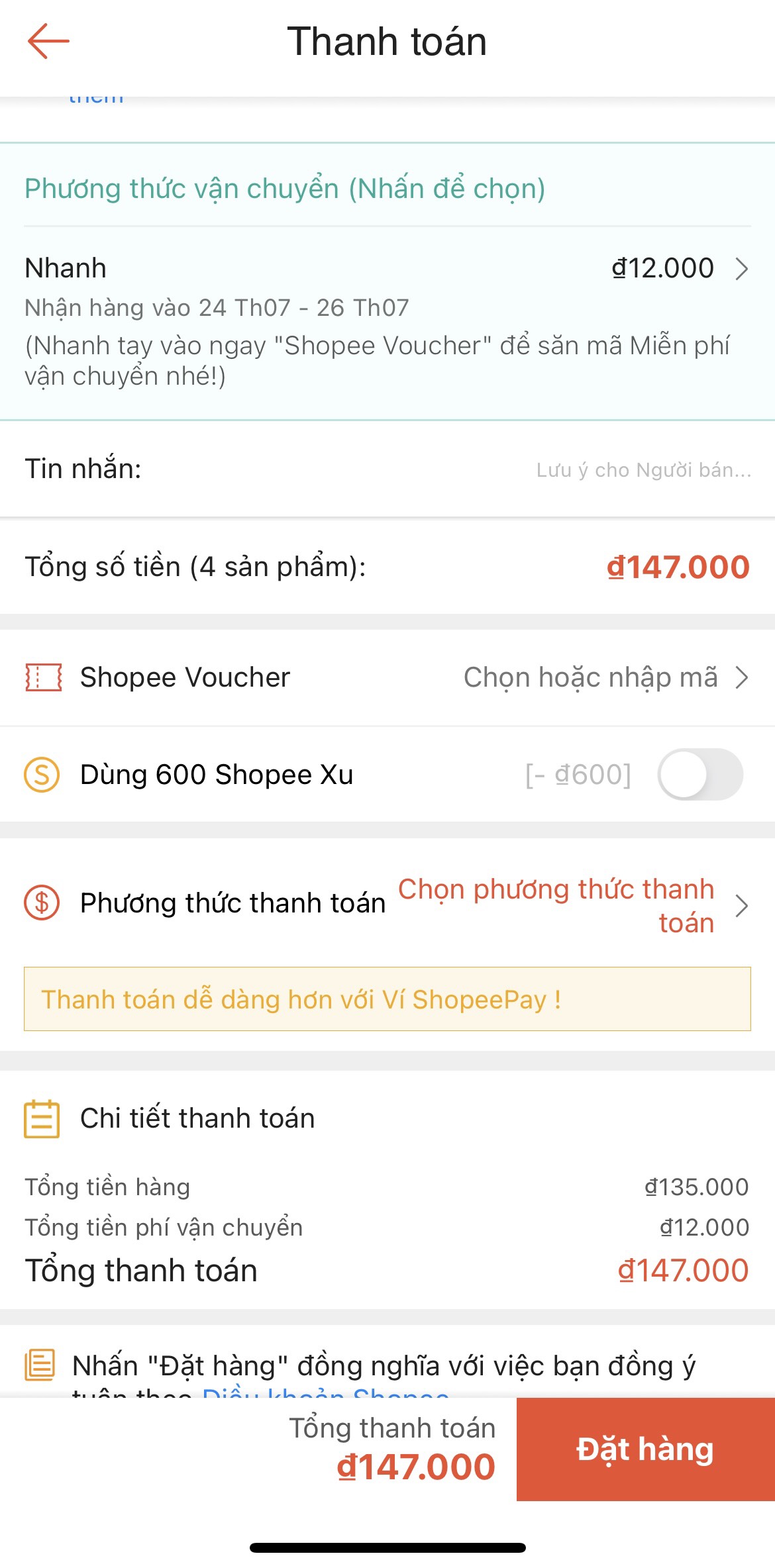 - Bước 3: Chọn sản phẩm cần mua (làm theo các bước ở mục 2) => Tại mục Shopee Voucher chọn voucher vận chuyển và mã giảm giá trên sản phẩm (nếu có). Sau đó chọn mua hàng => chọn hình thức giao hàng nhanh và thanh toán.