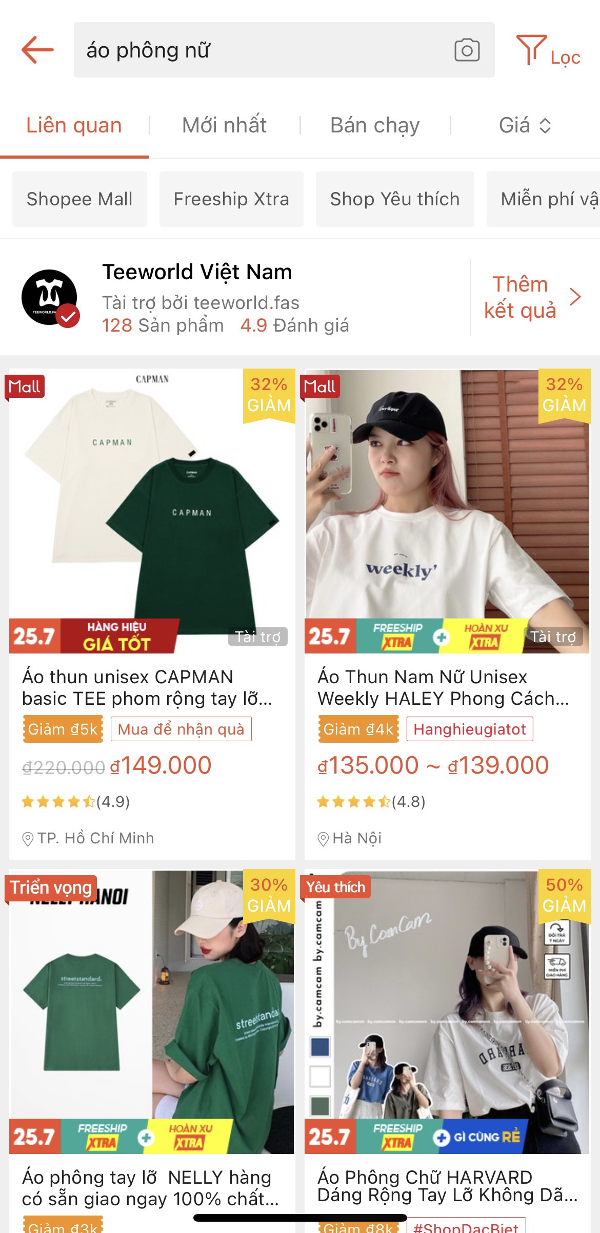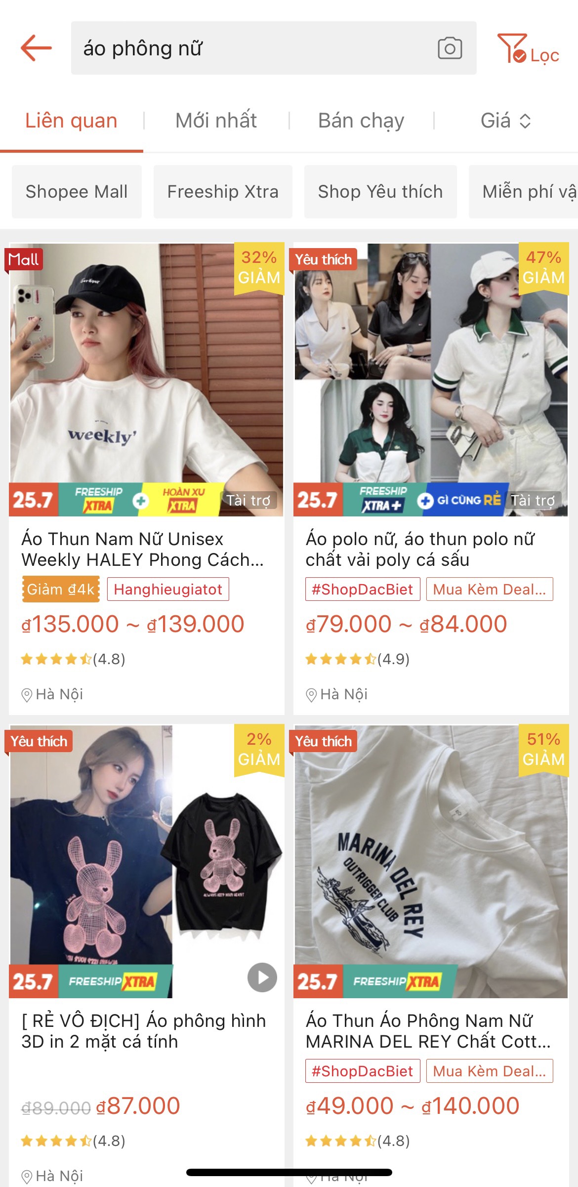 - Bước 1: Truy cập vào Shopee, trên thanh tìm kiếm tìm sản phẩm bạn muốn mua. Ví dụ là “áo phông nữ” như trong hình