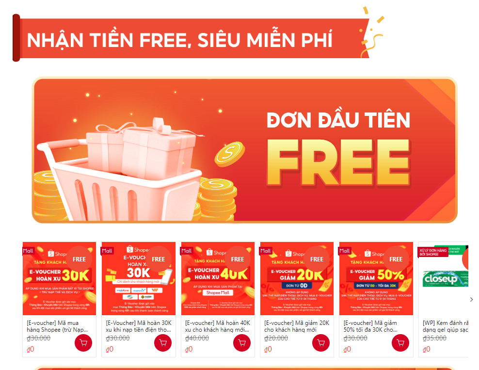 - Tặng khách mới Evoucher giảm 50% đơn 0Đ, tối đa 30k, áp dụng khi mua sản phẩm bất kỳ tại Shopee (ngoại trừ hóa đơn Nạp thẻ và dịch vụ).