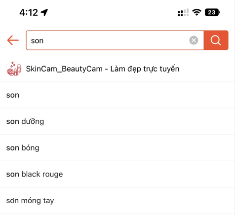 Bước 1: Truy cập SkinCam bằng cách vào app Shopee, tìm một từ khoá bất kỳ liên quan đến làm đẹp, mỹ phẩm. Ví dụ: son, kem nền,… Hoặc nhấn trực tiếp TẠI ĐÂY.