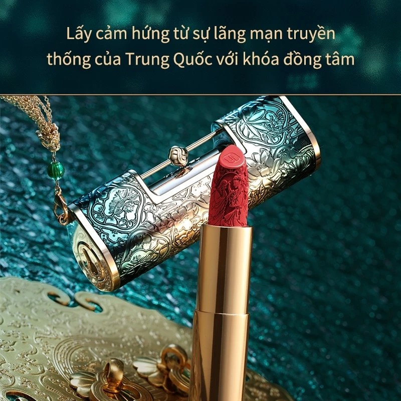 Thiết kế của son môi Khóa Đồng Tâm Florasisv là một trong những điểm khiến sản phẩm này nổi bật và thu hút nhiều người yêu thích ngay từ cái nhìn đầu tiên. Thỏi son được lấy cảm hứng từ biểu tượng “khóa đồng tâm” trong văn hóa cổ Trung Hoa – một hình ảnh gắn liền với tình yêu bền chặt và sự gắn kết đôi lứa. Thiết kế vỏ ngoài mô phỏng hình dáng một ổ khóa xưa với những họa tiết chạm khắc tinh xảo, tạo nên vẻ ngoài vừa lộng lẫy vừa mang tính nghệ thuật cao, khác biệt hẳn so với các dòng son phổ thông trên thị trường.