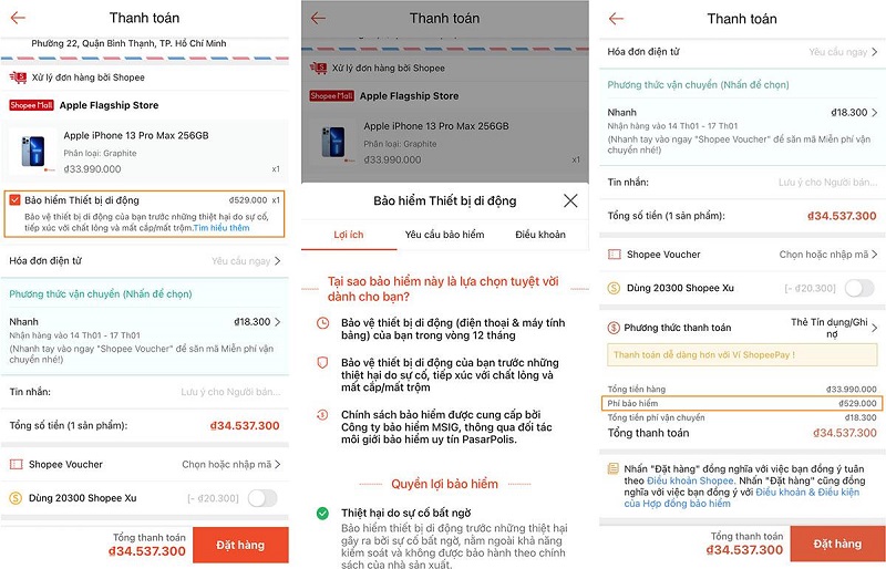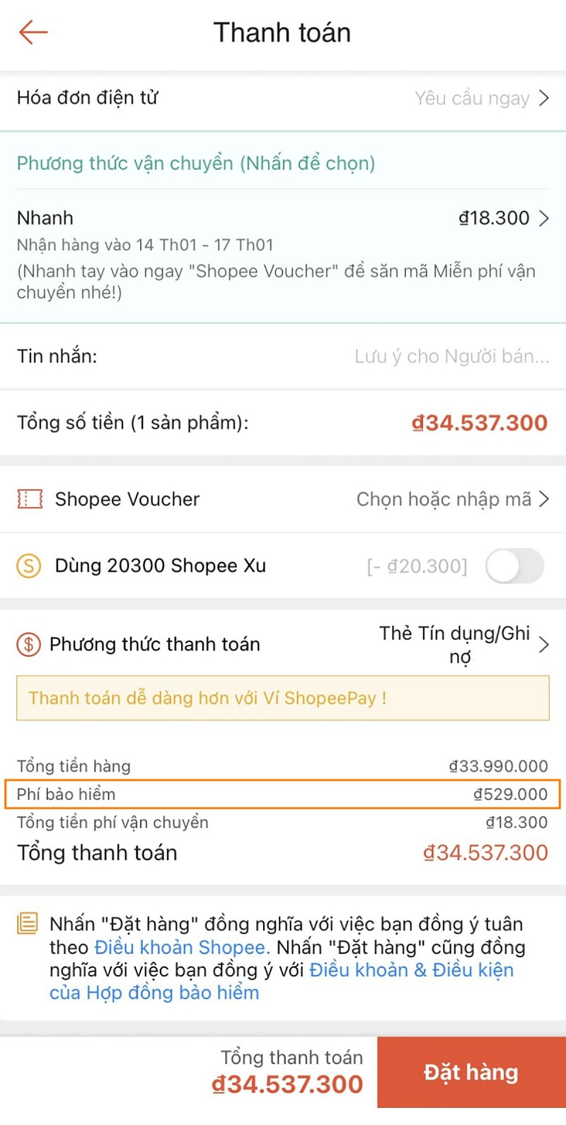 - Nếu bạn muốn mua gói bảo hiểm trên Shopee thì tiến hàng Đặt hàng như bình thường