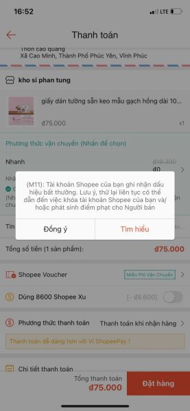 M11 xảy ra khi Shopee nhận thấy tài khoản của bạn có các dấu hiệu bất thường, vi phạm các điều khoản của nền tảng. Nếu gặp phải lỗi này, đừng cố thử đặt hàng tiếp đơn đó làm gì bởi nó thể dẫn tới việc bạn bị khóa tài khoản Shopee hoặc/và phát sinh điểm phạt cho người bán.