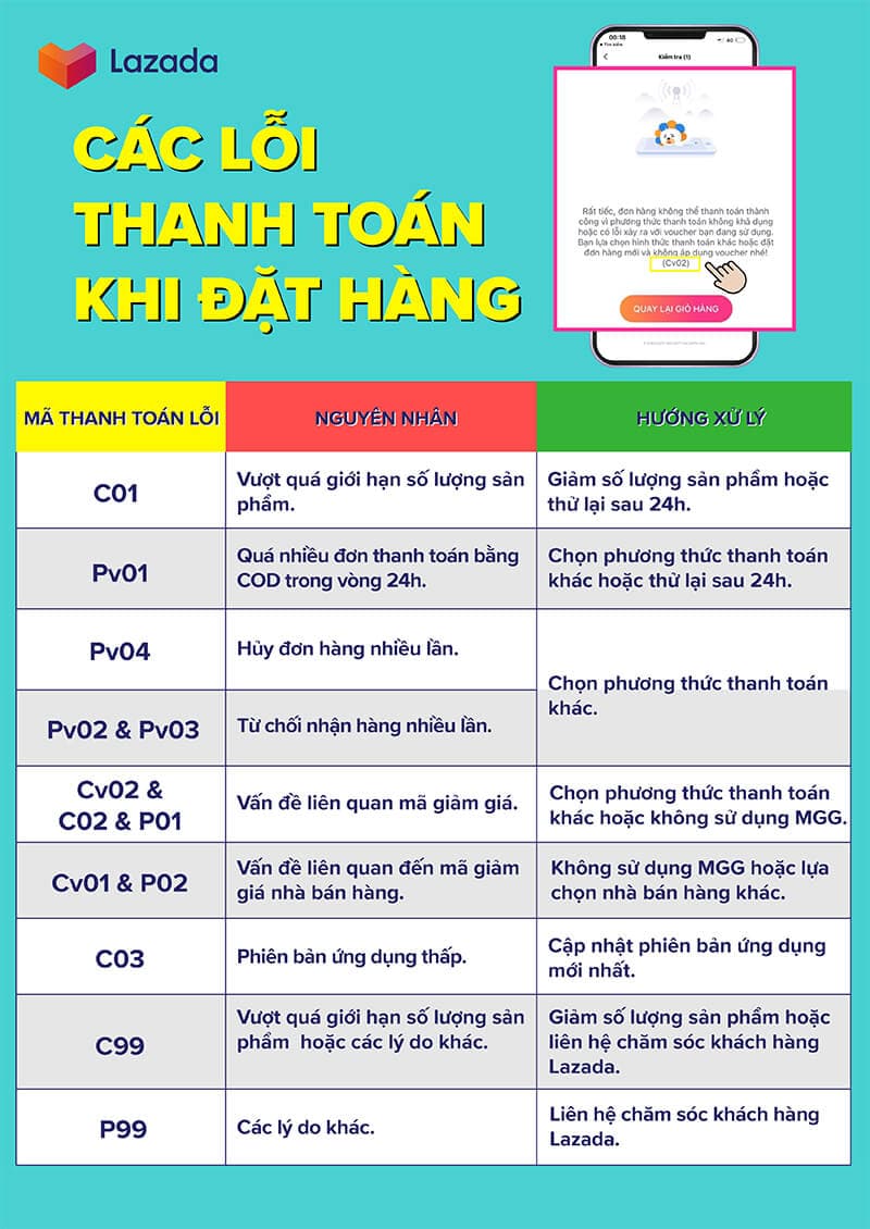 - Để khắc phục 3 lỗi Cv02, C02, P01 này thì bạn nên sử dụng phương thức thanh toán khác hoặc không sử dụng mã giảm giá hiện tại nữa. Nếu tình trạng này vẫn xảy ra thì bạn có thể liên hệ đến tổng đài Lazada để nhận sự giúp đỡ.