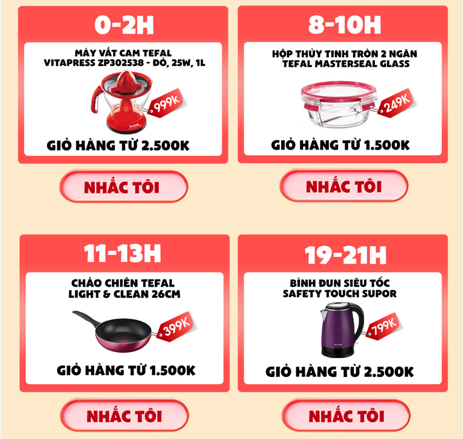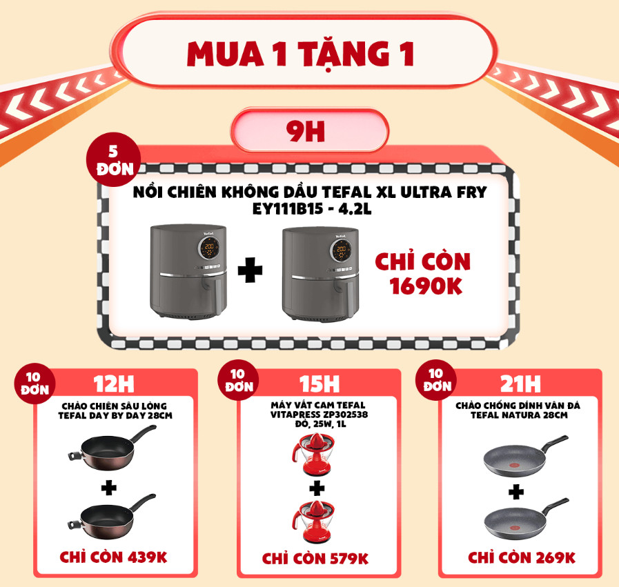 Voucher có, deal mua 1 tặng 1 có nhưng Tefal vẫn còn cả chương trình đua đơn nhận quà nữa. Chương trình diễn ra trong duy nhất 10/10 chia theo từng khung giờ: