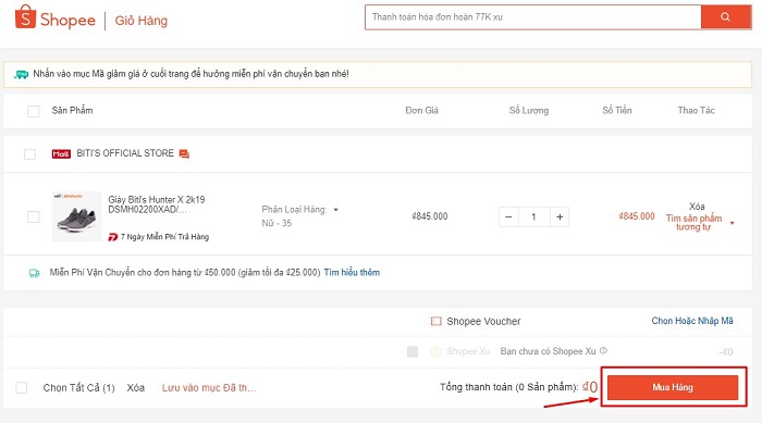Bước 2: Bạn chọn các món đồ bạn muốn mua sau đó ấn vào mục giỏ hàng rồi ấn vào nút “Mua hàng”.