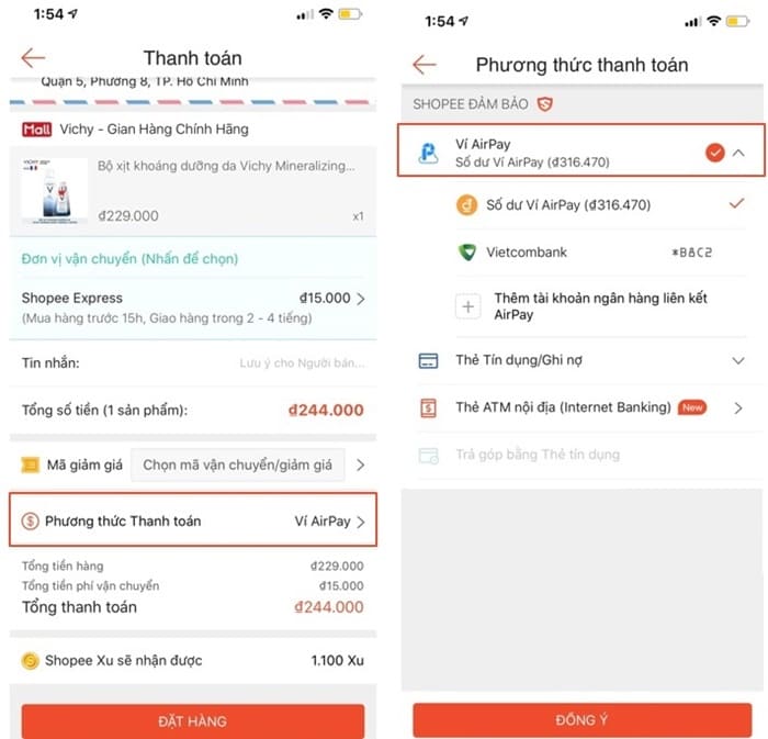 - Thanh toán qua ví điện tử ShopeePay, áp dụng cho đơn hàng có giá trị cần thanh toán nhỏ hơn hoặc bằng với số tiền có trong ví ShopeePay hoặc tài khoản ngân hàng có liên kết với ví điện tử ShopeePay