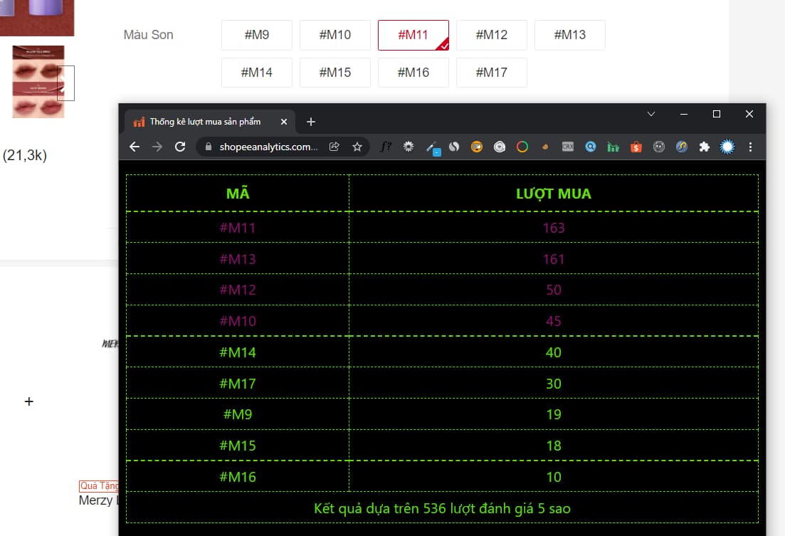 Mình muốn đặt mua một thỏi son nhưng không biết màu nào ổn, có quá nhiều màu đang được hiển thị trên sản phẩm. Mình quyết định code một đoạn nhỏ cào dữ liệu từ Shopee API để thống kê ra màu nào được mua nhiều nhất.
