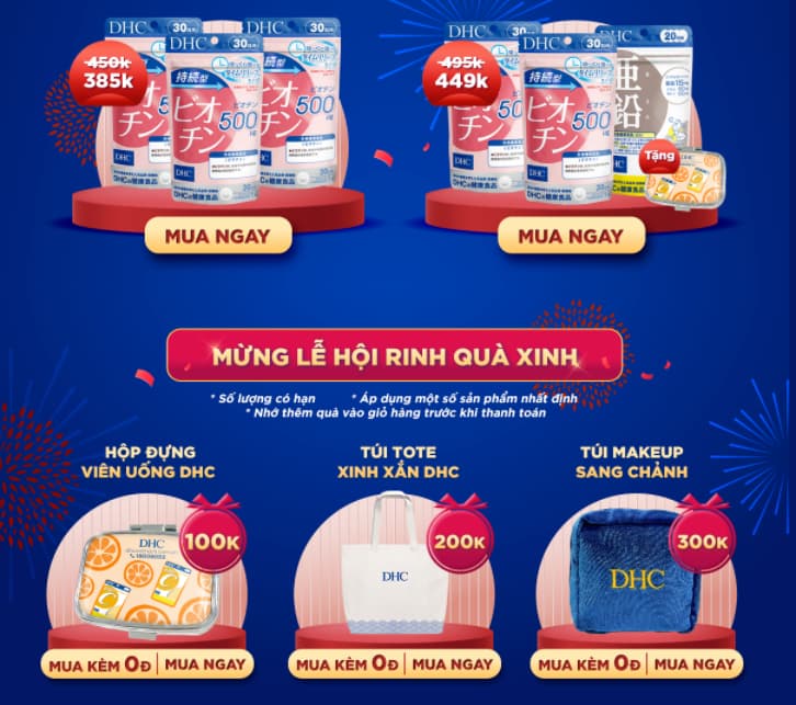 - Khi mua viên uống DHC trong tháng 4, bạn có cơ hội nhận được những phần quà như hộp đựng viên uống DHC, túi TOTE xinh xắn DHC, túi make up sang chảnh DHC...