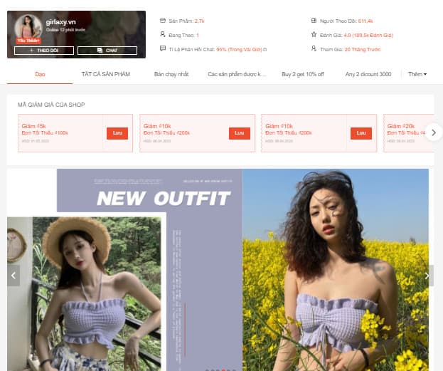 Tương tự Uptown Fasshion, Girlaxy.vn cũng là một gian hàng thời trang quốc tế sở hữu lượt theo dõi khủng tại Shopee. Mặc dù mới tham gia chưa đầy 2 năm nhưng shop đã có tận 620K lượt theo dõi, 110K lượt đánh giá, 2.7K sản phẩm cùng mức điểm đánh giá trung bình là 4.9/5*. Chỉ với các con số này cũng đủ cho thấy sức hút của Girlaxy.vn nói riêng và các gian hàng thời trang nước ngoài nói chung như thế nào.