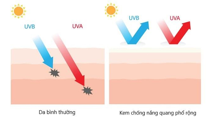 So với các sản phẩm chống nắng thông thường, kem chống nắng phổ rộng có tác dụng bảo vệ da một cách toàn diện hơn với ít nhất là 280nm đến 370nm. Nhờ vào thành phần giàu hoạt chất, các dòng kem chống nắng phổ rộng sẽ giúp bảo vệ da khỏi các tia UVA, UVB, UVC và cả ánh sáng xanh (có trong màn hình điện thoại, máy vi tính, đèn led,…) một cách hữu hiệu.