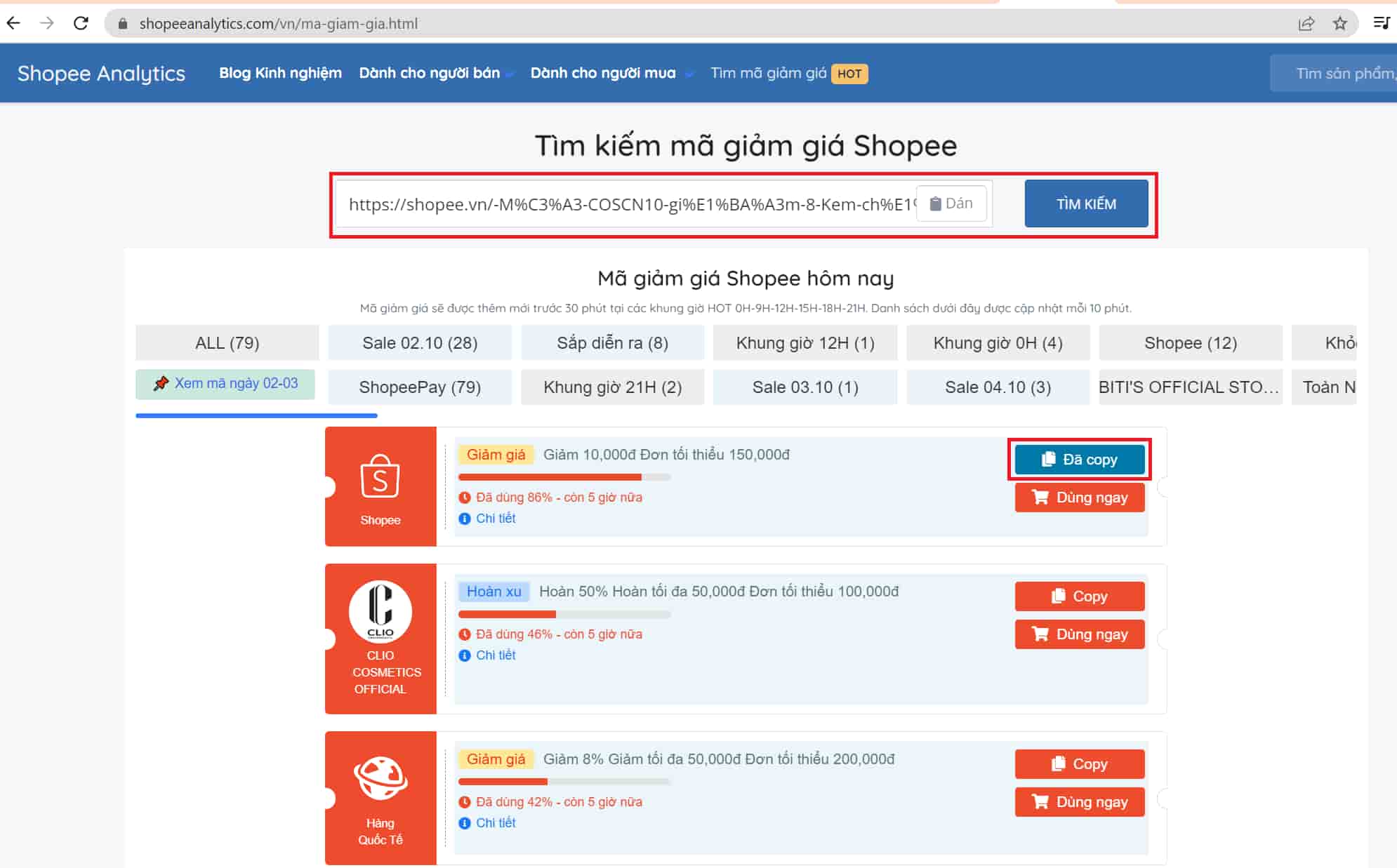 - Bước 2: Vào ShopeeAnalytics.com click chọn "Tìm mã giảm giá" rồi dán link sản phẩm kem chống nắng phổ rộng mà bạn đã copy ở bước 1, sau đó chọn và copy mã giảm giá phù hợp ở ngay bên dưới.