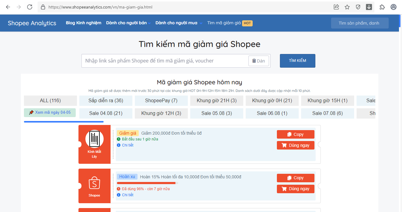 BƯỚC 2: Truy cập vào mục MÃ GIẢM GIÁ tại trang Shopeeanalytics. Sau đó dán link sản phẩm đã sao chép ở bước 1 vào ô tìm kiếm, Enter và sau đó các mã giảm giá siêu HOT sẽ hiện ra, bạn chỉ cần chọn mã bạn muốn rồi nhấn copy.