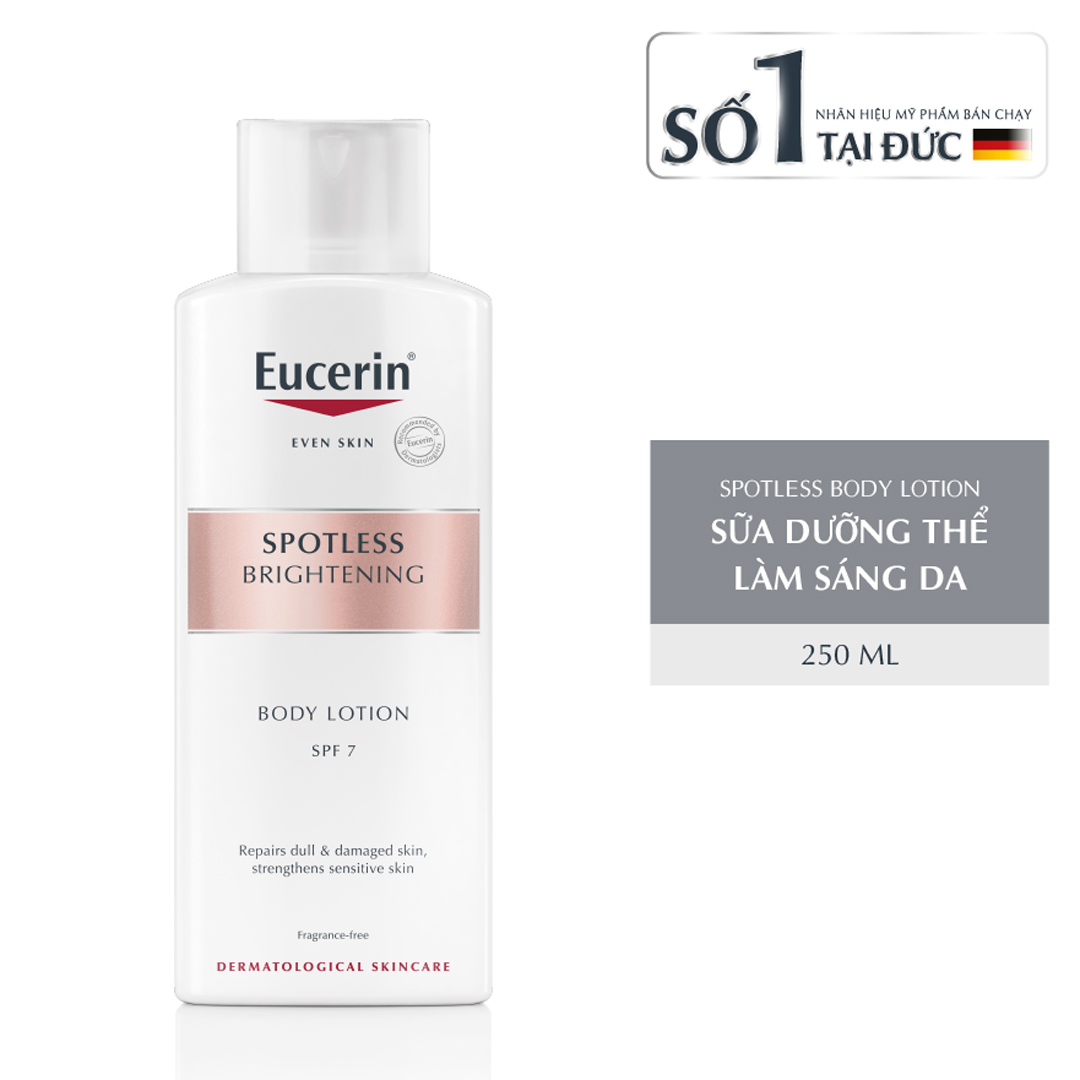 Sữa dưỡng thể trắng da Eucerin Spotless Brightening Body Lotion SPF7 250ml là vũ khí dưỡng da toàn thân hiệu quả đem đến tác dụng bổ sung độ ẩm cho làn da đồng thời giúp phân tán sắc tố melanin và tăng cường sắc tố da cải thiện các vùng da tối màu (thâm, sạm, nám hay cháy nắng).