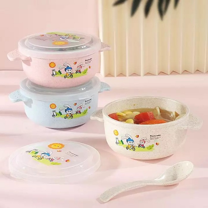 3. Bát ăn dặm lúa mạch cho bé có nắp kèm thìa, hình ngộ nghĩnh