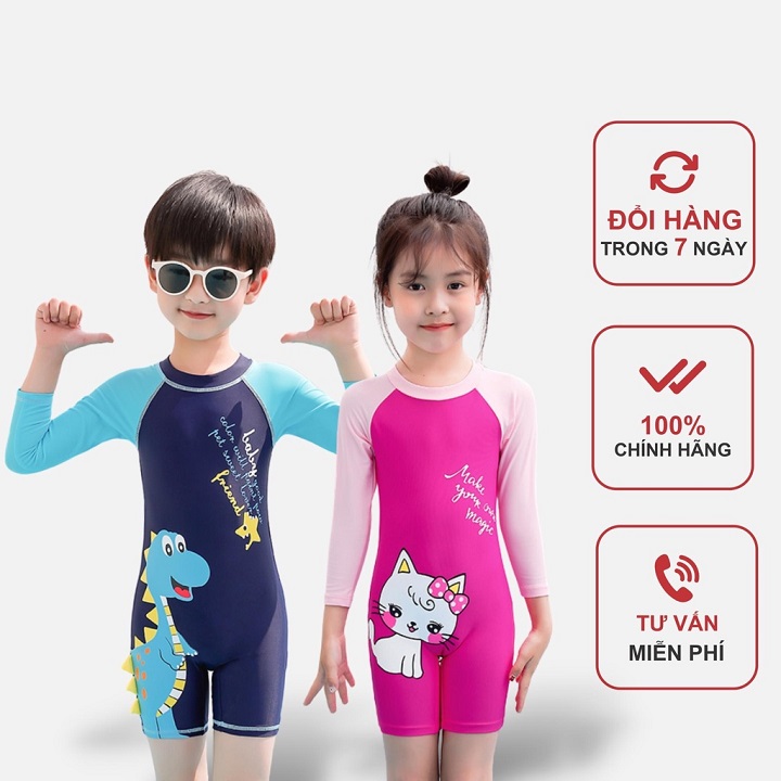Set đồ bơi trẻ em liền thân có họa tiết hoạt hình siêu đáng yêu và đa dạng màu sắc hứa hẹn sẽ khiến các bé thích mê càng mẹ nhé. Với chất liệu vải thun dày dặn, co giãn tốt; thiết kế đồ bơi liền thân cộc tay, quần đùi quen thuộc, đơn giản giúp các bé thoải mái vui đùa. Bộ đồ có cổ trụ, phía sau có khóa kéo chắc chắn, đường may cẩn thận giúp thiết kế gọn gàng, ôm sát cơ thể bé.