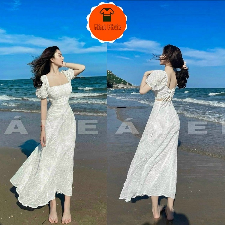 2. Váy maxi dài hở lưng Minh Phúc nhiều màu, cổ vuông tay phồng sexy