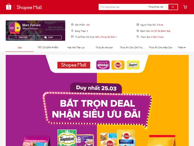 Mars Petcare pet shop là cửa hàng cung cấp thức ăn cho thú cưng được đánh giá chất lượng 4.9/5.0 với 318.5k lượt người theo dõi.