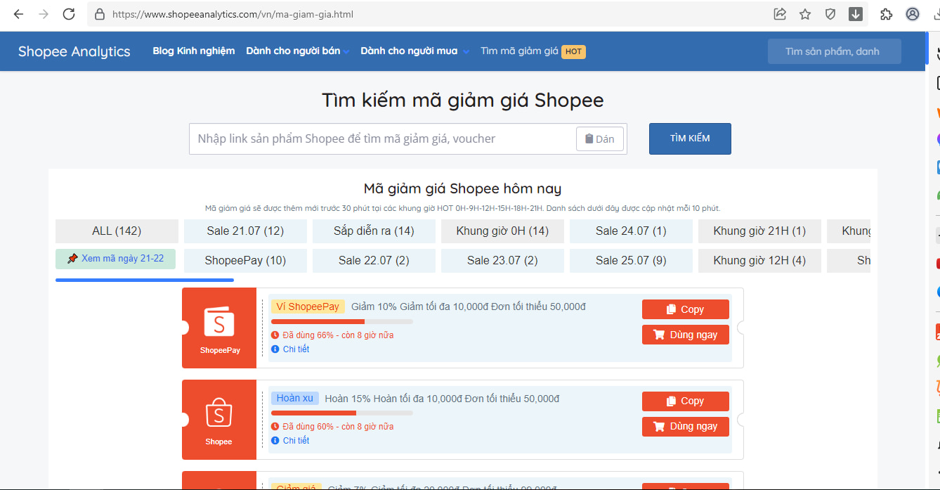 BƯỚC 2: Truy cập vào mục MÃ GIẢM GIÁ tại trang Shopeeanalytics. Sau đó dán link sản phẩm đã sao chép ở bước 1 vào ô tìm kiếm, Enter và sau đó các mã giảm giá siêu HOT sẽ hiện ra, bạn chỉ cần chọn mã bạn muốn rồi copy là xong.