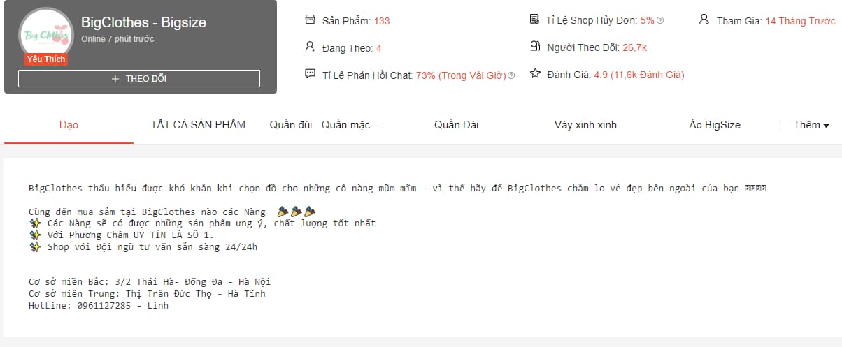 Trang chủ Big Clothes - Bigsize trên Shopee. Ảnh: Internet