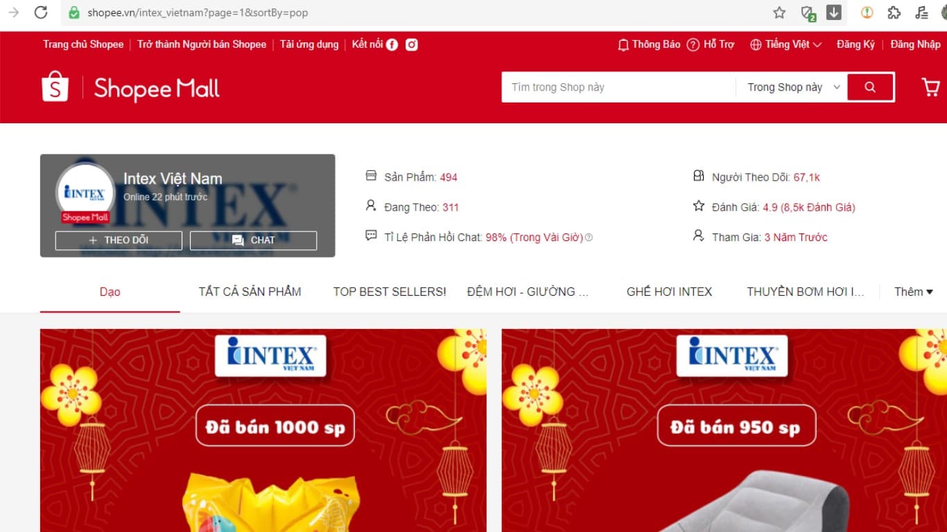 Khi nhắc đến shop về bể bơi, đầu tiên phải kể đến đó là Intex Việt Nam – một trong danh sách những sản phẩm về ngành hàng bể bơi, áo phao. Shop sở hữu lượt theo dõi là 67,1 K và 4.9/50 lượt đánh giá sao từ khách hàng (8,5k đánh giá). Những sản phẩm mà shop mang đến cho khách hàng của mình có chất lượng tốt, bền và thiết kế cực kì đa dạng, làm hài lòng người mua trong suốt quá trình sử dụng.