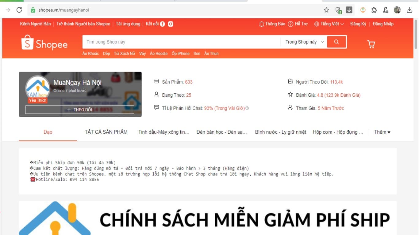 Shop MuaNgay Hà Nội được xem là địa chỉ uy tín của tất cả khách hàng quen thuộc. Shop sở hữu 113,4 ngàn lượt theo dõi; 4.8/5.0 đánh giá sao từ khách hàng (với 123,9 k đánh giá). Shop có 633 sản phẩm cung cấp đến khách hàng của mình. Đặc biệt trong chính sách bán hàng của mình, shop MuaNgay Hà Nội cam kết bán hàng chất lượng đúng như mô tả. Hàng bị lỗi sẽ được đổi trả trong vòng 7 ngày.