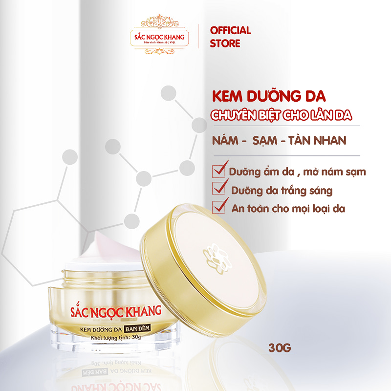 Kem trị nám Sắc Ngọc Khang có thành phần dưỡng chất được chiết xuất từ thiên nhiên như chiết xuất hoa anh đào, chiết xuất hoa súng, Axit Lipoamino (Undecylenoyl Phenylalanine), dầu Macadamia, dầu dừa phân đoạn, vitamin C và một số thành phần khác như dưỡng ẩm, nước khoáng,...