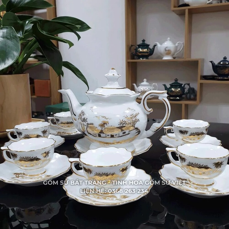 Bộ ấm chén uống trà Bát Tràng cao cấp bao gồm 1 ấm thể tích 500ml, 1 đĩa ấm đường kính 12.5cm, 6 chén có quai miệng 6.5cm và 6 đĩa chén đường kính 10.5cm. Bộ ấm chén có họa tiết về cảnh làng quê yên bình với con sông, hàng cau, bến nước,... vô cùng tinh xảo và sắc nét. Dòng men trắng của bộ ấm chén được làm công phu tỉ mỉ đến từng chi tiết.