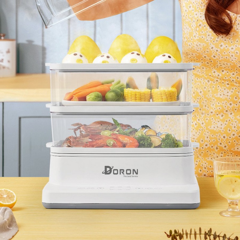 Nồi hấp điện Doron 209 được thiết kế 3 tầng với tổng dung tích lên đến 20L, có thể hấp được nhiều loại đồ ăn khác nhau. Lồng hấp của nồi làm bằng nhựa PP cao cấp, dễ dàng tháo rời và an toàn cho sức khỏe. Sản phẩm sẽ tự động ngắt điện khi hết nước. Bên cạnh đó, sản phẩm có khay chứa nước riêng, lỗ thoát nước chống dính.