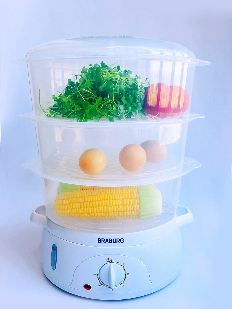 Nồi hấp điện 3 tầng Braburg có phần nhựa khay hấp làm từ nhựa ABS trong suốt cao cấp, không chất độc hại và có thể quan sát thực phẩm bên trong nồi khi đang chế biến; phần thân nồi có màu trắng sạch sẽ, có núm vặn cơ điều chỉnh thời gian bằng nhựa cứng. Đặc biệt là nồi sẽ tự động ngắt nên bạn không phải mất thời gian canh chừng nồi.