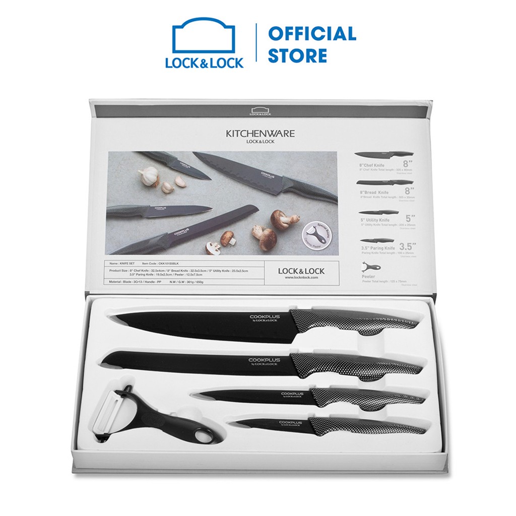 Bộ dao nhà bếp LocknLock COOKPLUS CKK101S5BLK gồm 5 sản phẩm: 4 dao chính, 1 dụng cụ gọt vỏ trái cây. Tiện dụng và phù hợp với nhiều nhu cầu sử dụng khác nhau.