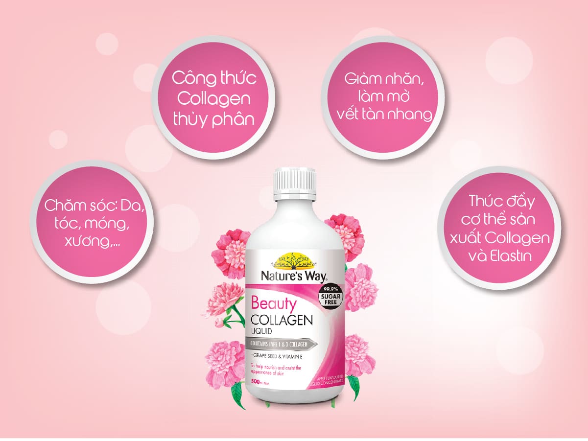Beauty Collagen Liquid là dòng collagen dạng uống có chứa collagen thủy phân, vitamin E, tinh chất hạt nho hàm lượng cao. Nhờ đó, giúp cải thiện các vấn đề trên da do lão hóa như nám, sạm, tàn nhang, các vết nhăn,…cực kỳ hiệu quả. Không những thế, sản phẩm này còn giúp giữ ẩm và làm mềm da, giúp da mềm mại và đàn hồi tốt hơn. Ngoài ra, collagen dạng uống Beauty Collagen Liquid còn có tác dụng cải thiện độ chắc khỏe của tóc, hạn chế tình trạng rụng tóc vô cùng hiệu quả.