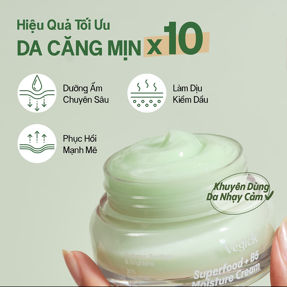 Kem dưỡng ẩm Vegick là kem dưỡng ẩm thuần chay, phục hồi da nhạy cảm. Sản phẩm giúp tăng cường hàng rào bảo vệ da, thúc đẩy tái tạo làn da đang bị tổn thương, điều tiết dầu thừa, giúp da khỏe mạnh. Với 30% siêu thực vật ép lạnh, 5% B5 thì chắc chắn hiệu quả mà nó mang lại sẽ làm bạn bất ngờ.