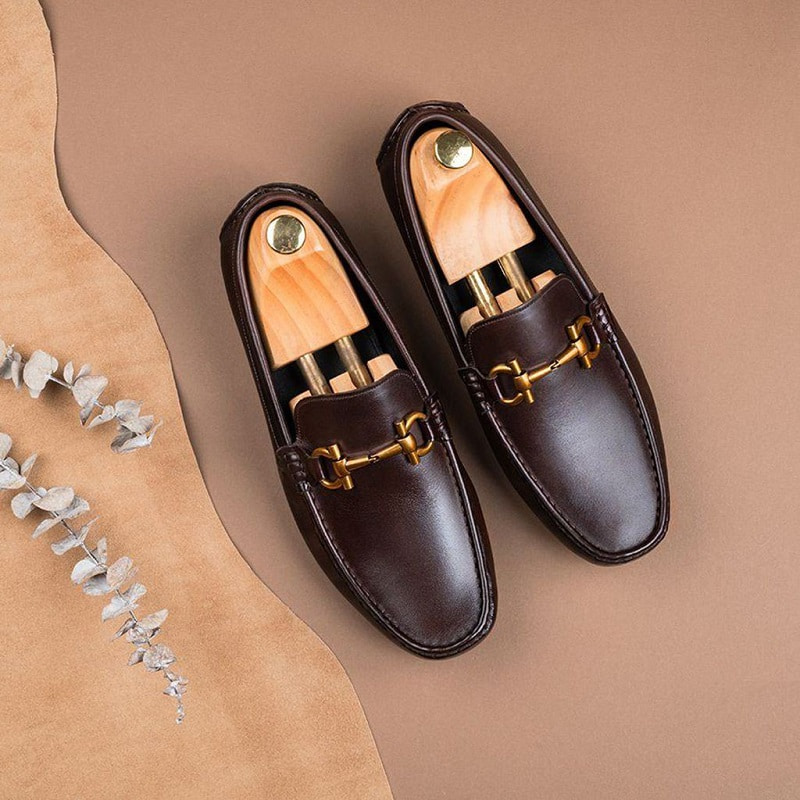 Thiết kế giày có lớp lót da bò bên trong siêu mềm siêu êm. Kiểu dáng giày Horse Moccasin cổ điển, thời trang. Lớp đế cao su nguyên khối chắn chắn, xẻ rãnh chống trơn trượt, giày được cách điệu với họa tiết đai kim loại vắt ngang mui giày độc đáo. Mũi giày được thiết kế với form tròn và bo viền chắc chắn.