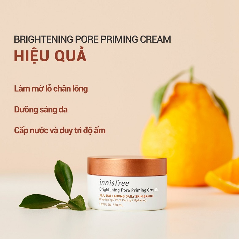 Kem dưỡng sáng da Brightening Pore Priming Cream có thành phần chiết xuất từ vỏ quýt tươi Jeju Hallabong giúp cung cấp nước, làm mờ lỗ chân lông và cải thiện bề mặt da mềm mại, căng mướt. Sản phẩm có kết cấu nhẹ nhàng, thấm nhanh nên bổ sung nước tức thì cho da, duy trì độ ẩm cần thiết cho da luôn mềm mịn. Ngoài ra, sản phẩm còn giúp cải thiện độ đàn hồi của da.