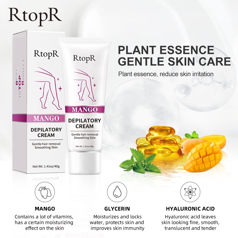 Kem tẩy lông vùng kín RtopR chứa chiết xuất từ xoài, kết hợp với công thức tẩy lông nâng cấp, không gây kích ứng da, sạch, lâu trôi, dễ dàng tẩy hoặc rửa lại. Sản phẩm đem đến cho bạn làn da mịn màng và ẩm ướt khi sử dụng sản phẩm. Nếu bạn thấy da khó chịu thì vui lòng ngưng sử dụng sản phẩm ngay nhé.