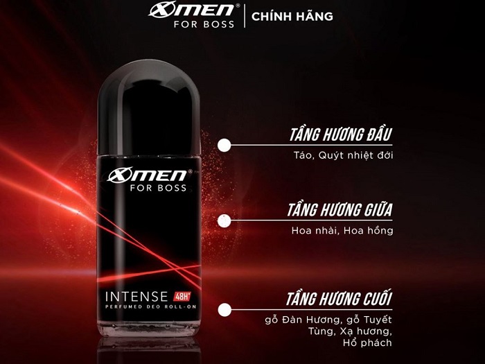 Lăn khử mùi X-Men For Boss Intense có công thức chuyên biệt dành cho nam giới với mùi hương trầm đầy nội lực. Thành phần chính của sản phẩm từ chiết xuất gỗ đàn hương và hổ phách giúp khử mùi hiệu quả, giảm tiết mồ hôi trên cơ thể nhanh chóng.