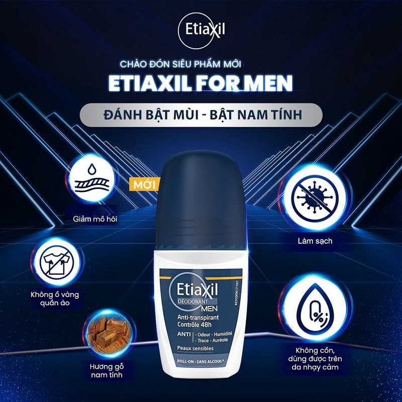 Lăn khử mùi nam Etiaxil là loại lăn không chứa hương hiệu, không chất bảo quản, không phẩm màu. Lăn khử mùi nam Etiaxil có thể ngăn mồ hôi lên đến 2-3 ngày hiệu quả, không lo áo dính nước, không ố vàng và đặc biệt là không làm bị thâm nách. Sản phẩm giúp làn da dưới cánh tay luôn khô và sạch sẽ thoáng mát. Khi sử dụng lăn khử mùi sẽ tạo 1 lớp màng bảo vệ làn da dưới cánh tay, bảo vệ nách bạn khỏi các tình trạng nguy hiểm, gây hại.